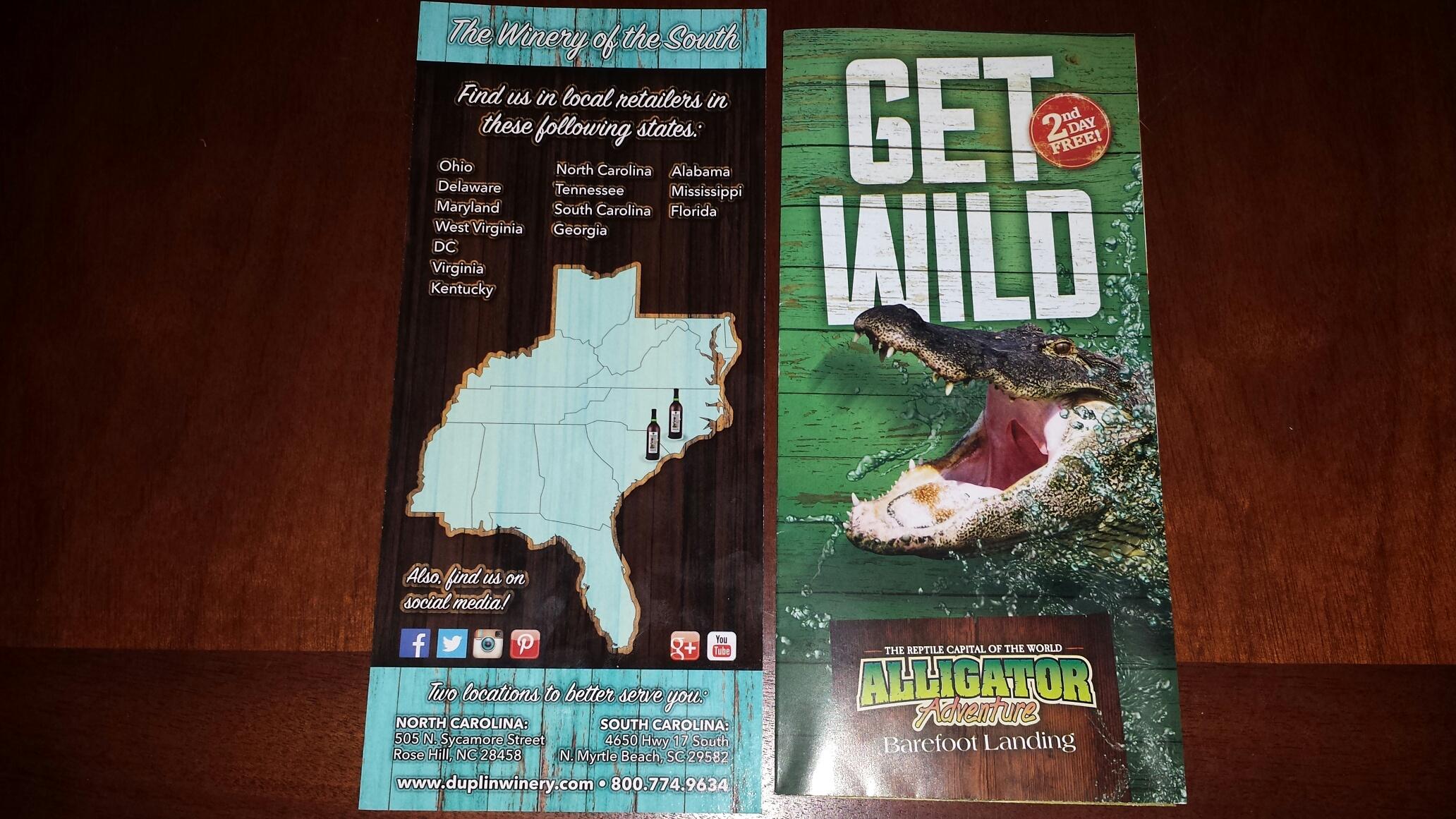 Alligator Adventure is located on hwy 17 just outside of Barefoot Landing, next to Duplin Winery. Such close proximity to Duplin Winery provides a natural pairing with Alligator Adventure. Your park entrance fee grants you a free ($5 value) wine tasting of at least 10 different wines, crackers, and a complimentary wine glass to take home with you. If you are like my husband and I, you’ll probably want to upgrade to the deluxe tasting ($5 cost) which gives you small cup of dip for your crackers. (Ours was a cream cheese habanero-pineapple dip that was amazing. I don’t like spicy food, but this had the flavor without the heat. We purchased the habenero-pineapple salsa to bring home and mix with cream cheese ourselves.) Before leaving Duplin, take a moment to taste their homemade fudge. My favorite was the mint chocolate fudge which I had to buy as well. All-in-all, this pairing of adventure and libations appeals to the child and adult in all of us.